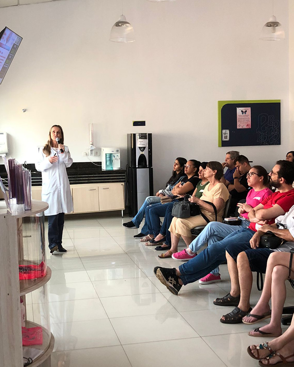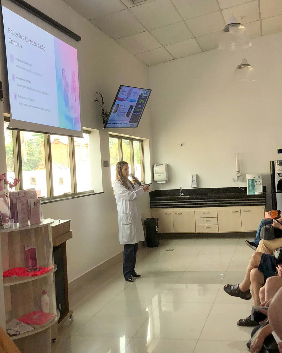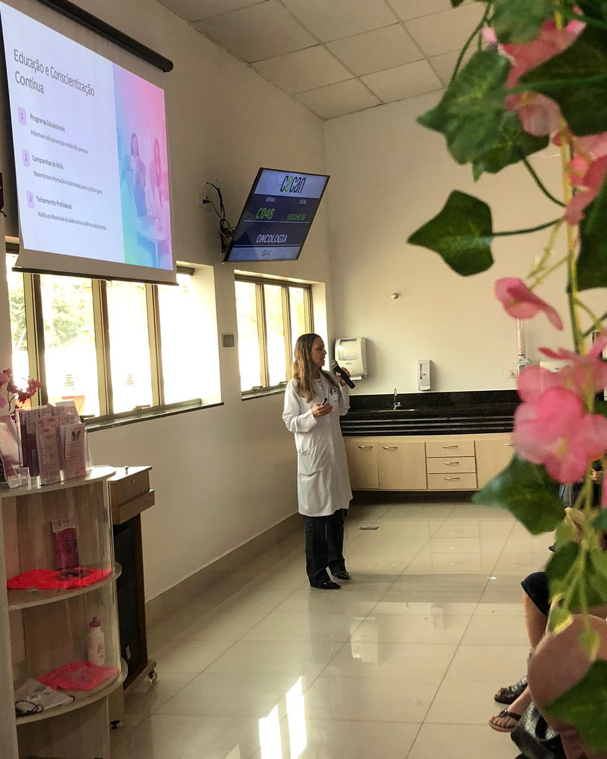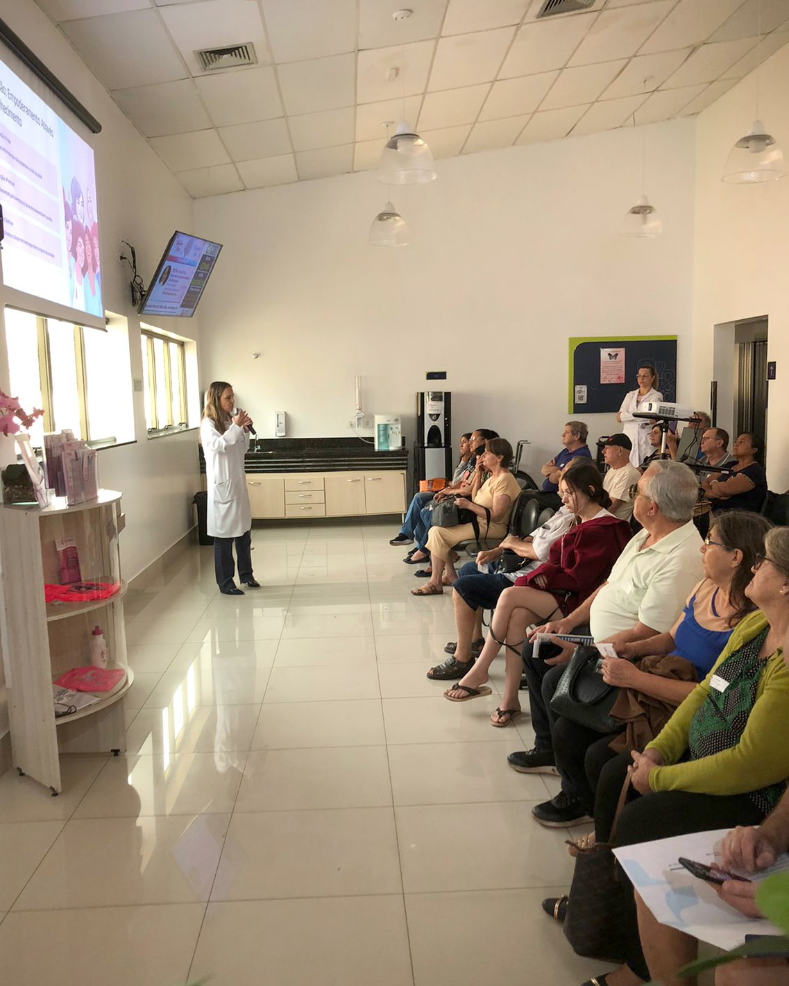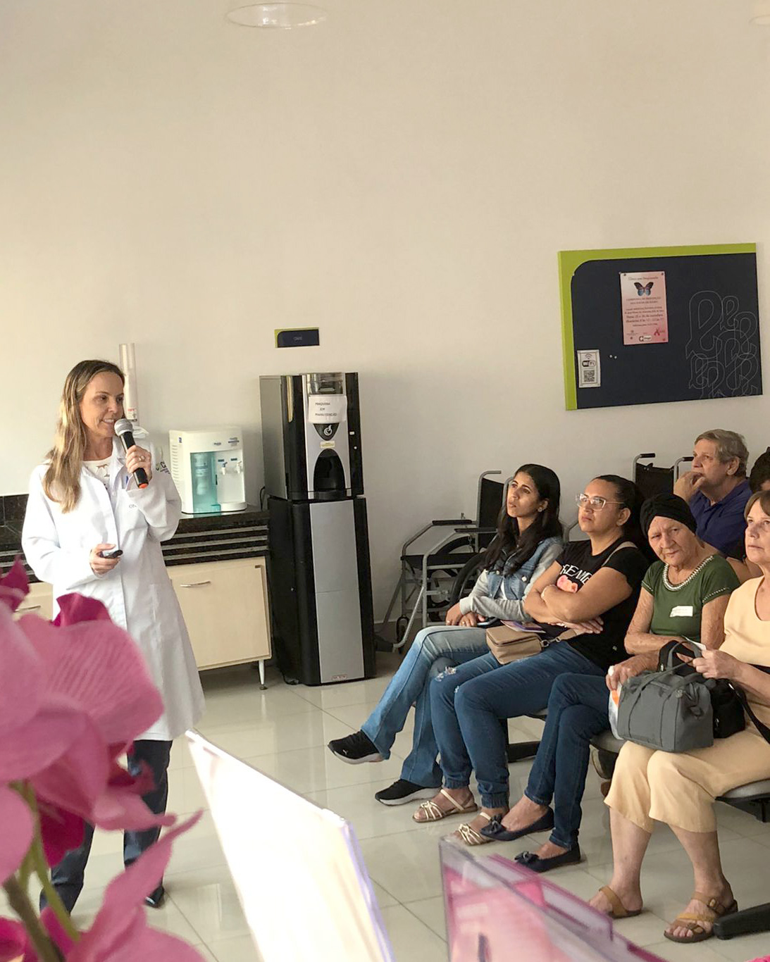 Na manhã desta terça-feira, 08, ela falou a pacientes, familiares e acompanhantes, na recepção da Unidade de Quimioterapia, para lembrar “O que toda mulher precisa saber sobre o câncer de mama”.